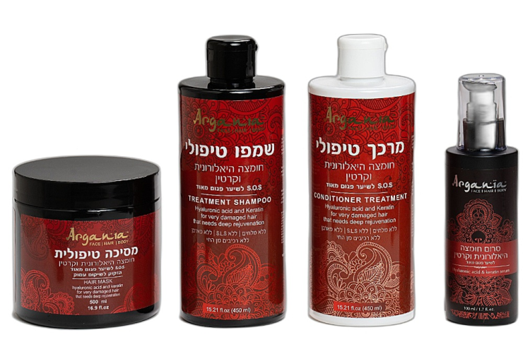 ארגניה מארז לשיער פגום מאוד – שמפו ומרכך 450 מ״ל, מסכה 500 מ"ל וסרום 100 מ"ל המועשרים בחומצה היאלורונית וקרטין