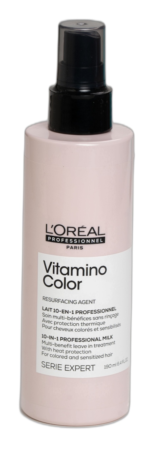 תחליב-ספריי רב-תכליתי לשיער צבוע מבית לוריאל פרופסיונל, מסדרת Vitamino Color. מוצר “10 ב-1” שמעניק לשיער הגנה, לחות, ברק, טיפול ומניעת פגיעה בצבע, מבלי הצורך במספר מוצרים שונים.